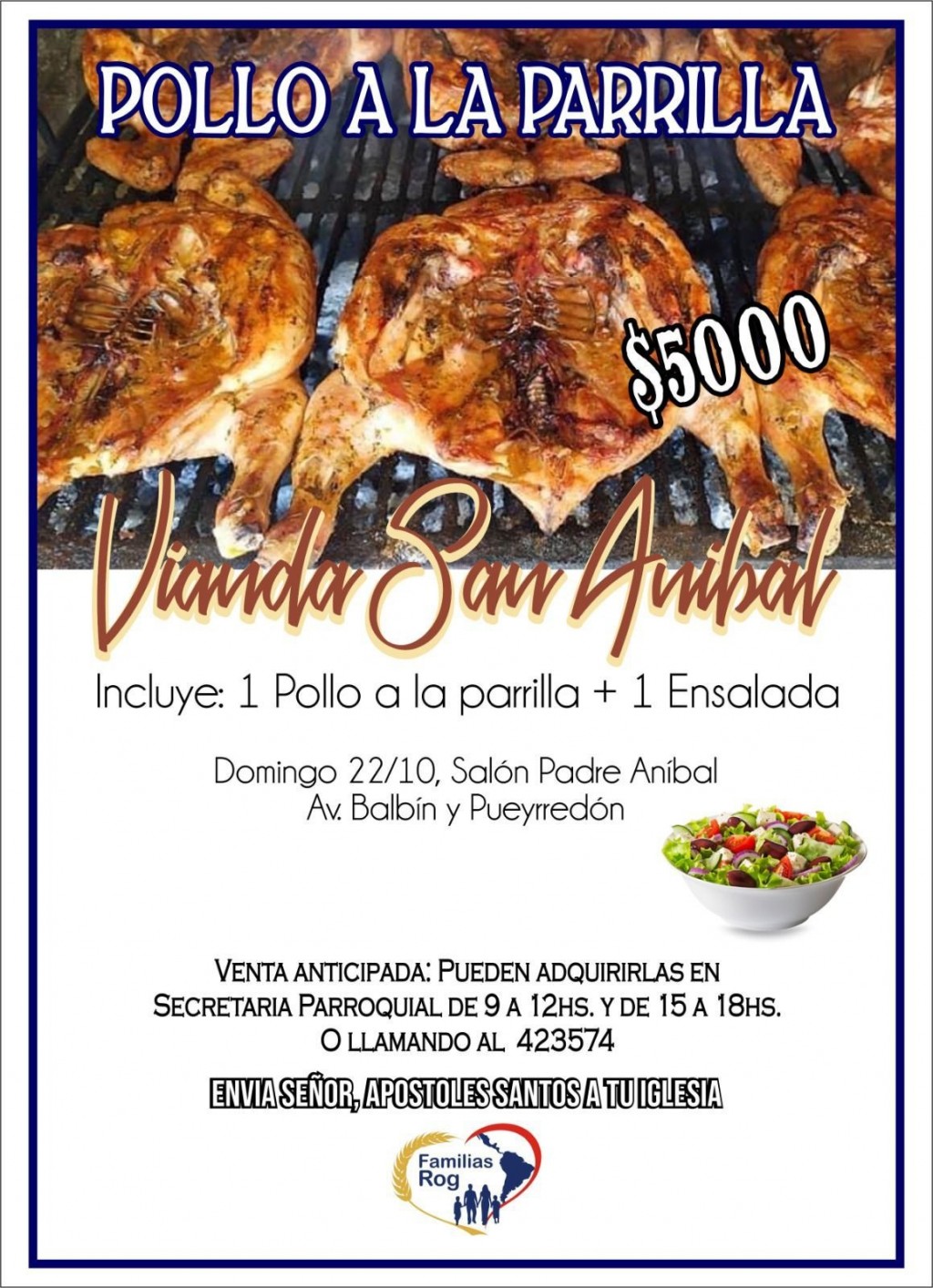 Este domingo en el Salón Padre Aníbal se venderá pollo a la parrilla. Hay venta anticipada llamando al 423574 y tiene un costo de $5000. Lo recaudado será para solventar los costos del encuentro de familias Rog que se realizará en el mes de noviembre. AUDIO: RICARDO VENTANCÚ - familias rog