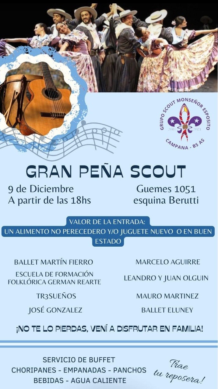 La organiza el Grupo Scout Monseñor Espósito este próximo sábado desde las 18 en su sede de Güemes 1051 esquina Berutti. Habrá música y servicio de buffet. El valor de la entrada es un alimento no perecedero o un juguete en buen estado. AUDIO: STEFANIA ROJAS - jefe scouts
