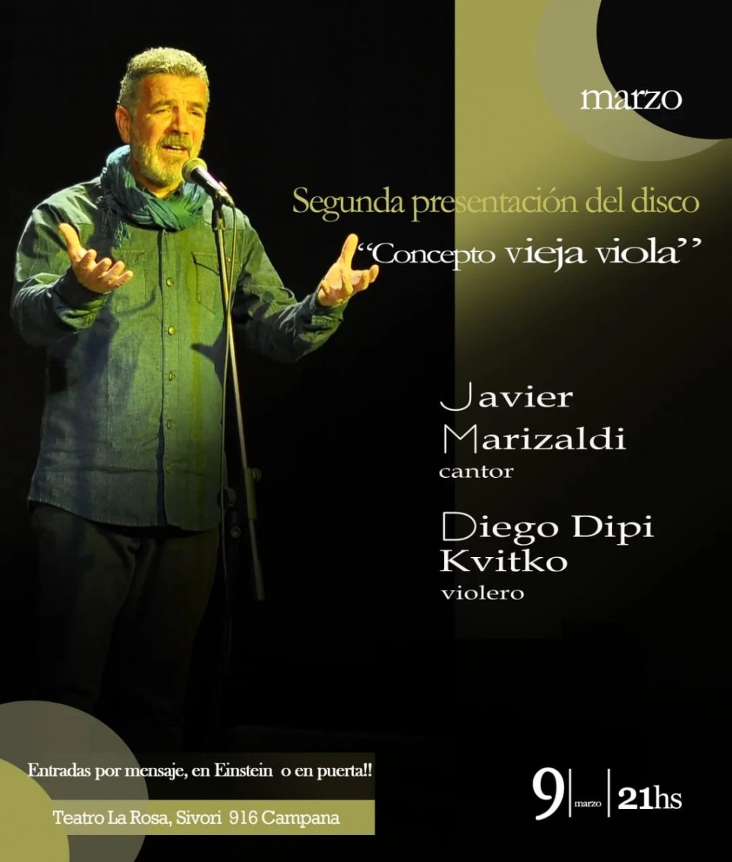 Este sábado se presentará por segunda vez en La Rosa el disco “Concepto Vieja Viola” de Javier Marizaldi. Será a partir de las 21 y las entradas ya están a la venta. AUDIO: JAVIER MARIZALDI - cantante
