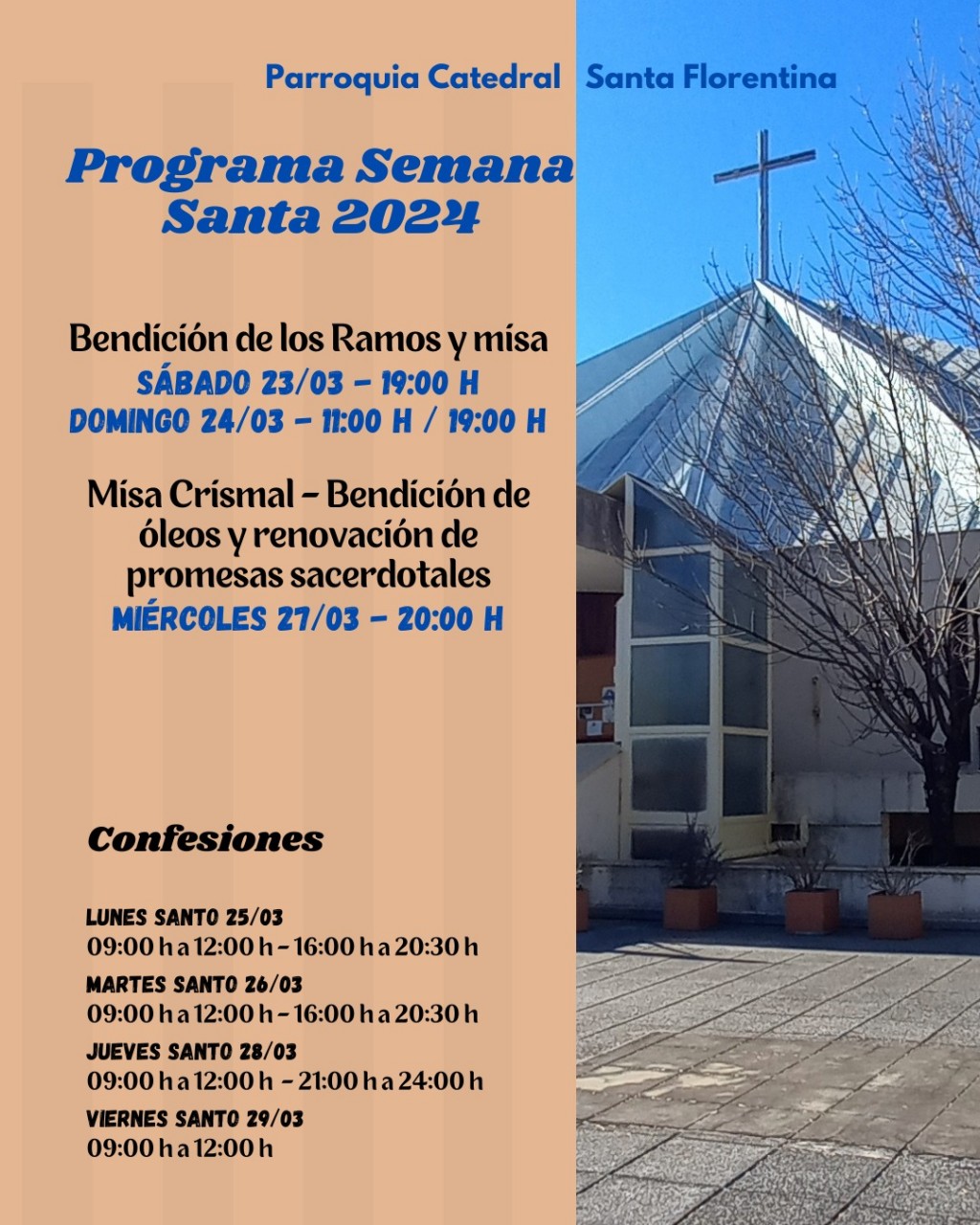 Mañana se rezará el Vía Crucis en la plaza Eduardo Costa. El domingo, en la Catedral, se bendecirán los ramos en las misas. Además, invitan a la misa Crismal del miércoles 27 a las 20 donde se bendecirán los óleos y se renovarán las promesas sacerdotales. AUDIO: FERNANDO CREVATÍN - párroco