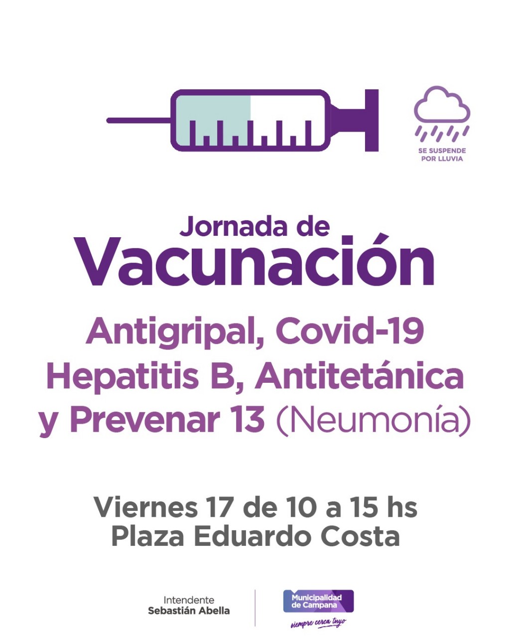 Será este viernes en la Plaza Eduardo Costa. La jornada, llevada a cabo por la Secretaría de Salud del Municipio, se extenderá de 10 a 15 para mayores de 12 años. Se aplicarán dosis de Antigripal, Covid-19, Hepatitis B, Prevenar 13 (Neumonía) y Antitetánica (Doble Adulto). AUDIO: ELEONORA PENOVI - subsecretaria de salud