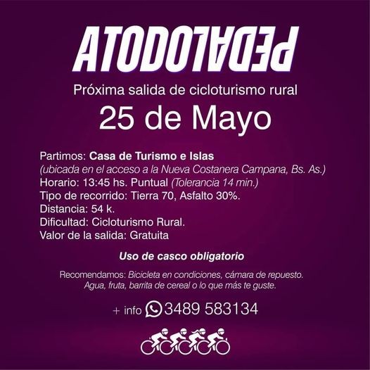 Organizada por A Todo Pedal será mañana a las 13:45 desde la Casa de Turismo e Islas. Será un recorrido de 54 km de camino rural. La salida es gratuita y con uso obligatorio de casco. AUDIO: DANIEL BURGUEÑO - A todo Pedal