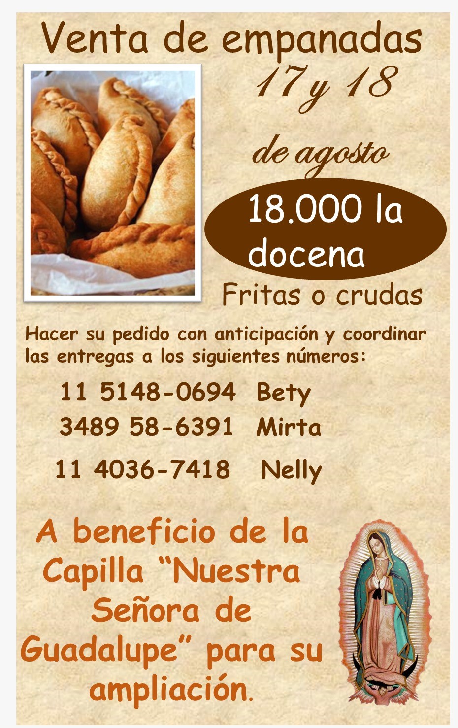 Se realizará este fin de semana una venta de empanadas para colaborar con las obras de ampliación de la Capilla Nuestra Señora de Guadalupe de Barrio Los Pioneros. Se pueden adquirir fritas o crudas y los pedidos se realizan con anticipación. AUDIO: ERNESTO PÉREZ - comunidad Capilla Ntra. Sra. de Guadalupe