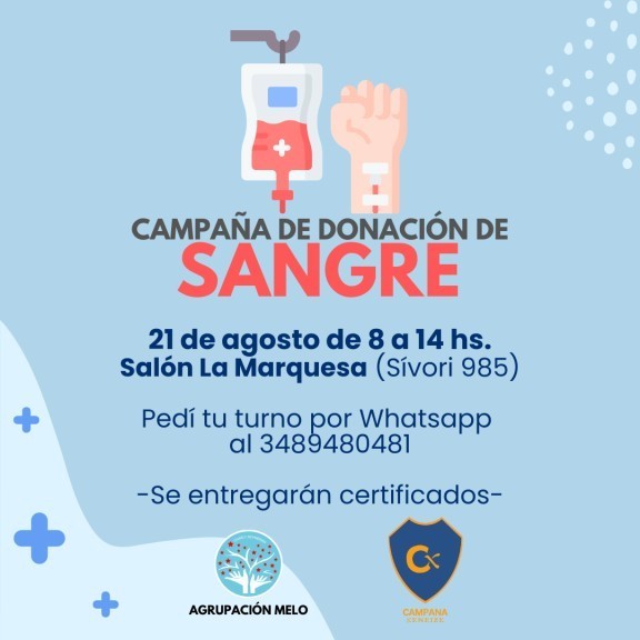 La Agrupación Melo junto a la Asociación Civil Campana Xeneize invitan a la comunidad a sumarse a la campaña de donación voluntaria de sangre mañana de 8 a 14 en el salón La Marquesa. AUDIO: JAVIER CONTRERAS - Agrupación Melo