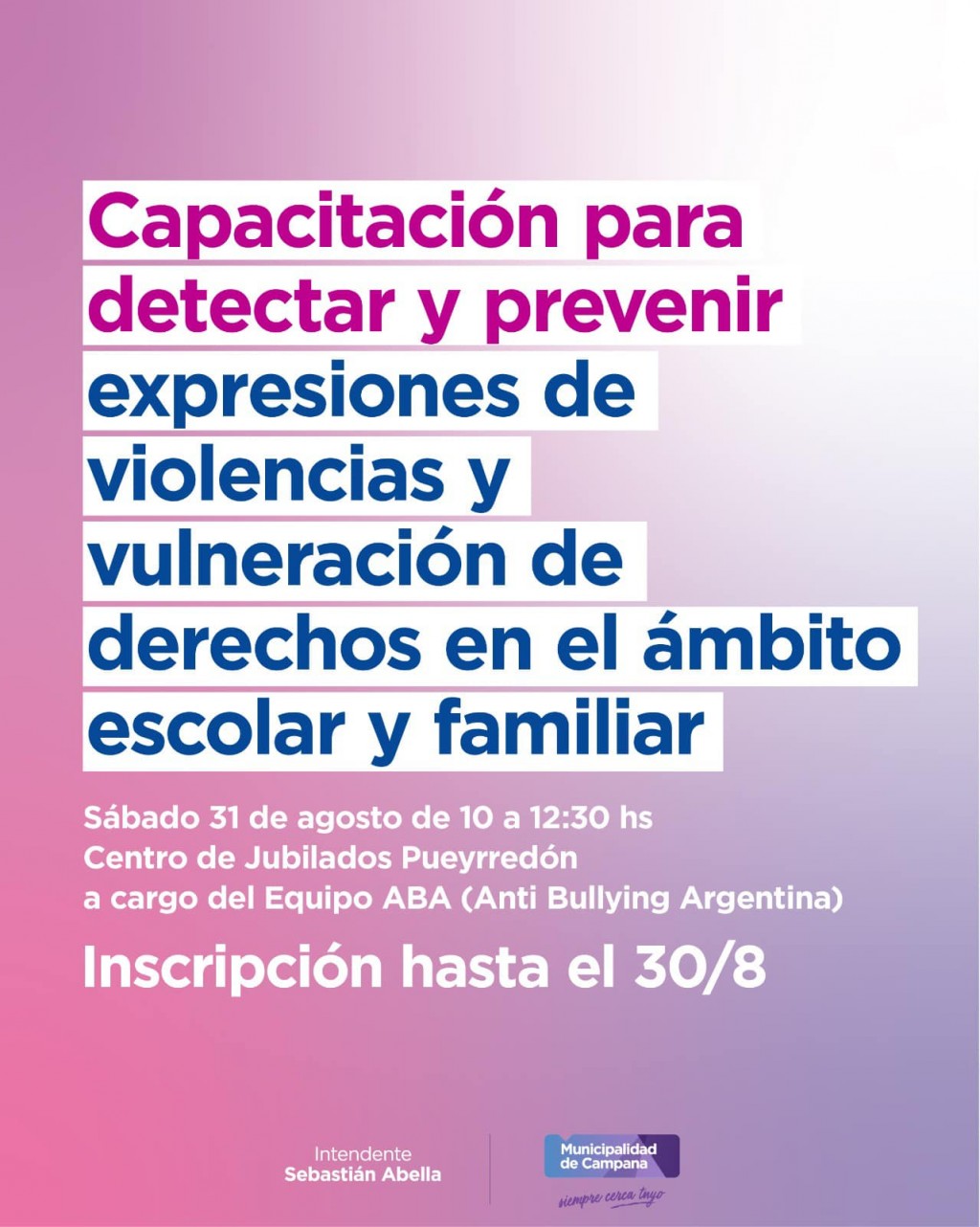 Finaliza el programa de capacitación para detectar y prevenir las violencias y vulneración de derechos en el ámbito escolar y familiar. Será este sábado 31 de agosto de forma gratuita en el Centro de jubilados de la calle Pueyrredón de 10 a 12:30. Estará a cargo del equipo ABA, especialistas en el abordaje de dichas temáticas. AUDIO: FERNANDA LAGO - directora de educación