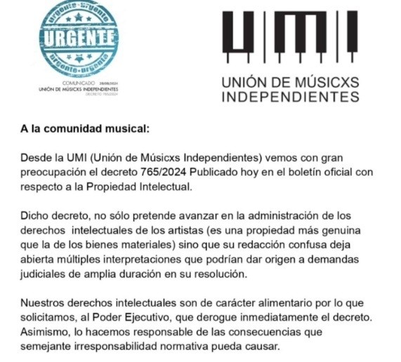 La Unión de Músicos Independientes (UMI) advierte que el decreto 765/2024 publicado en el Boletín Oficial con respecto a la Propiedad Intelectual avanza en la administración de los derechos intelectuales de los artistas. Sostienen que aún presenta ciertas ambigüedades. AUDIO: GUSTAVO ROHDENBURG - Pte. UMI