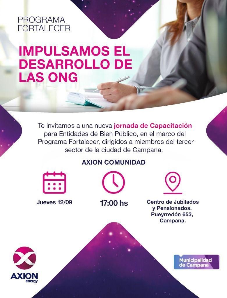Se realizará esta tarde una nueva capacitación en el Centro de Jubilados y Pensionados de la calle Pueyrredón. Está organizado por el Municipio y la empresa Axion energy. No requiere inscripción previa. La conferencia se denomina "Hacer el bien, bien" y brindará conceptos y herramientas para llevar adelante una gestión administrativa adecuada. AUDIO: NICOLÁS MASSETTO - RSE Axion