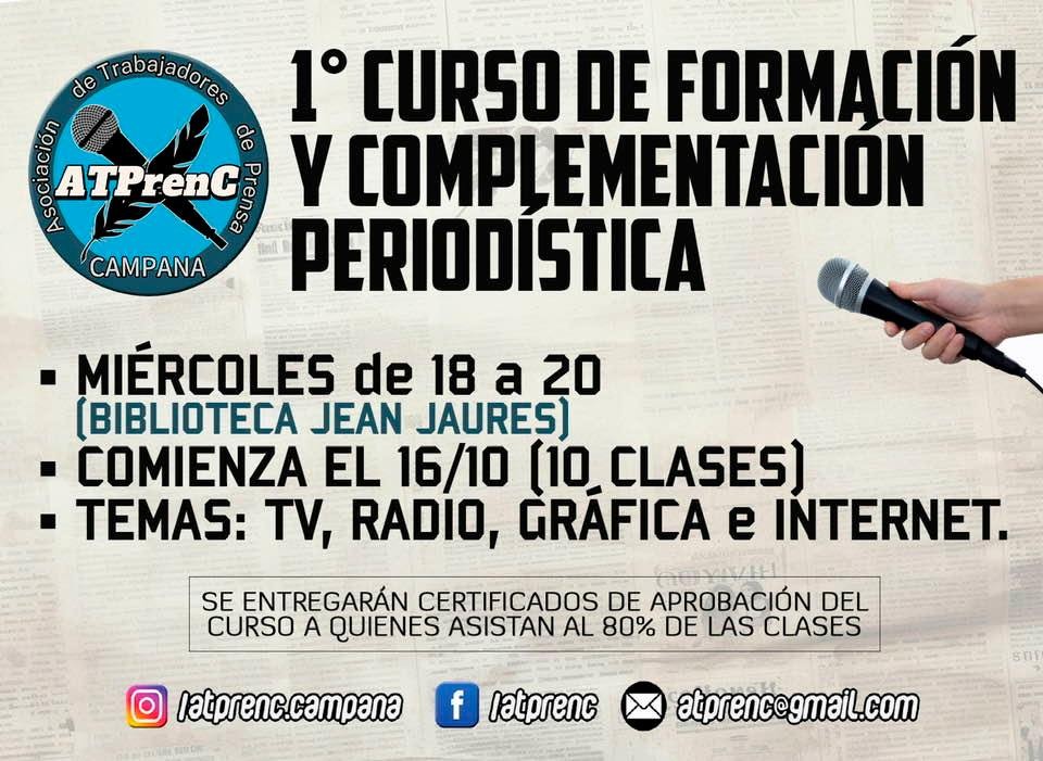 Se realizará el primer curso de formación y complementación periodística organizado por la Asociación de Trabajadores de Prensa de la ciudad. Las actividades comenzarán el 16 de octubre. Será gratuito y tendrá una duración de 10 clases todos los miércoles de 18 a 20. AUDIO: STELLA MARIS CARDOZO - Pte. ATPrenC