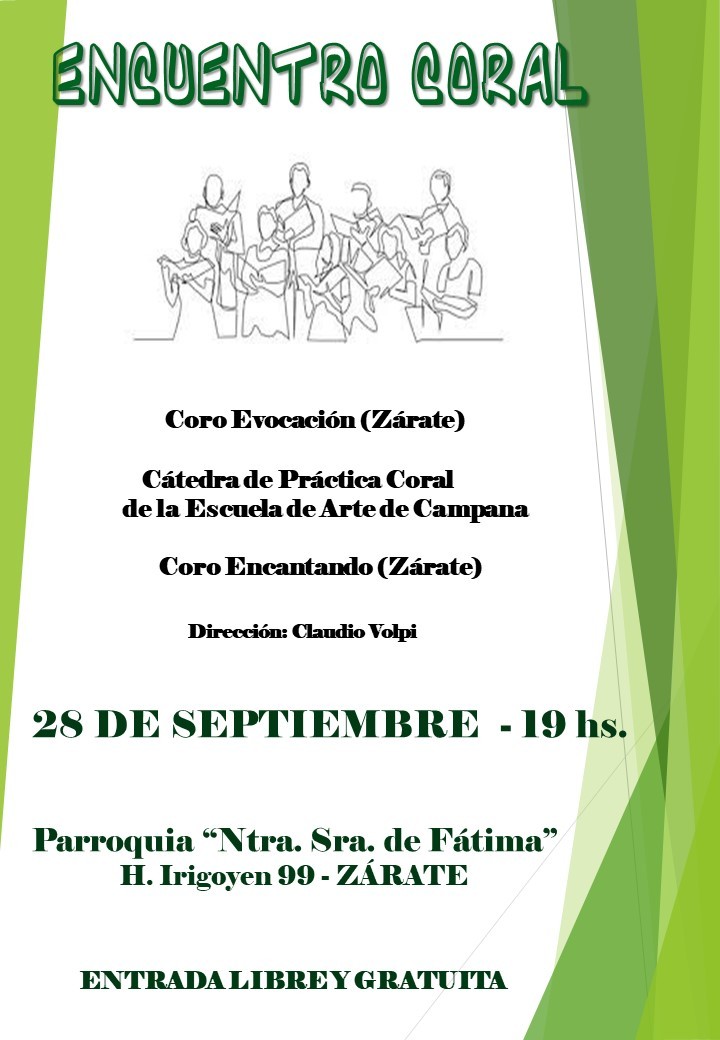 Será mañana a las 19 en la Parroquia Ntra. Sra. De Fátima de Zárate con entrada libre y gratuita. Estarán presentes los Coros Evocación y Encantando de Zárate y la Cátedra de Práctica Coral de la Escuela de Arte de Campana. AUDIO: CLAUDIO VOLPI - director de coros