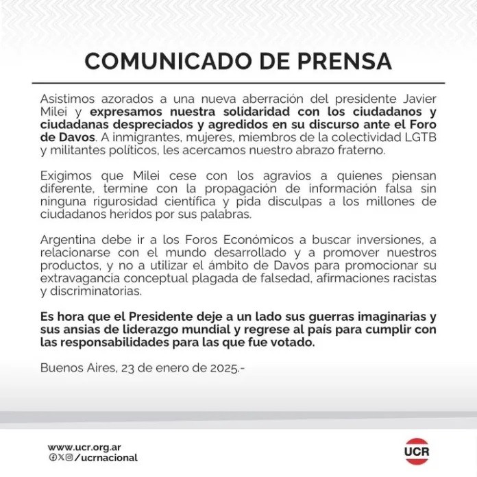 La UCR Campana se sumó al repudio publicado en un comunicado por la UCR Nacional por los agravios ejercidos por el presidente Javier Milei en el Foro de Davos. El espacio político a nivel local expresó su solidaridad con quienes se sintieron agredidos con su mensaje. AUDIO: MARTÍN MUNITICH - Pte. electo UCR Campana
