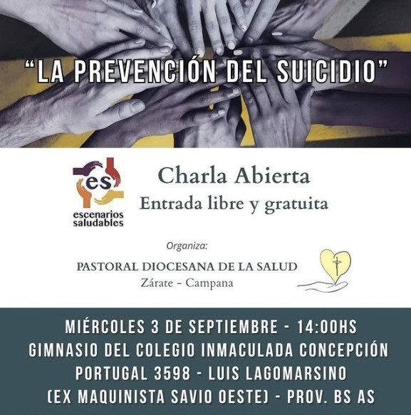 Organizada por la Pastoral Diocesana de la Salud de Zárate – Campana se realizará este miércoles una charla abierta, libre y gratuita sobre la Prevención del Suicidio. Se dará en el Gimnasio del Colegio Inmaculada Concepción de Maquinista Savio a las 14. AUDIO: PADRES JORGE MENEGHELLO - delegado diocesano de pastoral de la salud
