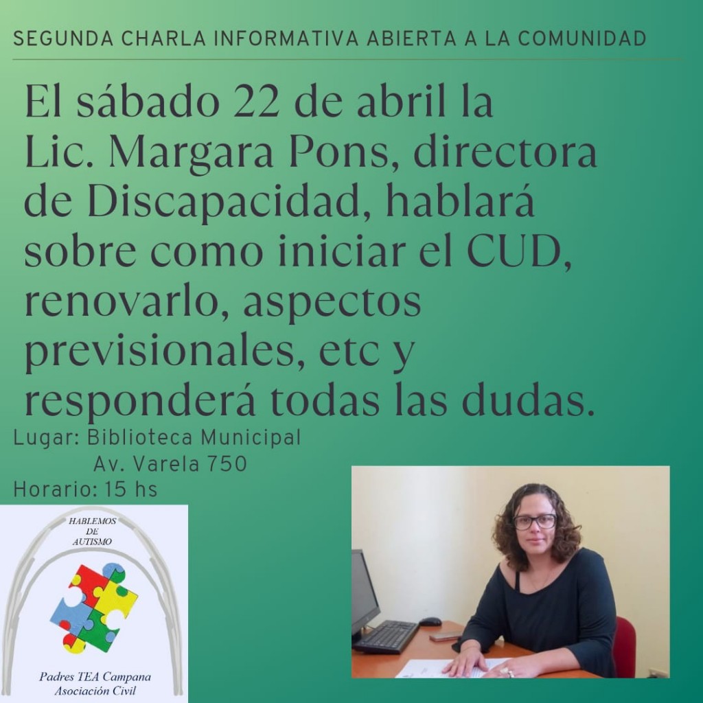 La Asociación Padres TEA Campana organiza la segunda charla informativa abierta a la comunidad. Será el sábado a las 15 en la Biblioteca Municipal y estará a cargo de la Lic. Márgara Pons, directora de discapacidad. AUDIO: FERNANDA FERREYRA - Presidenta Asoc. Padres TEA