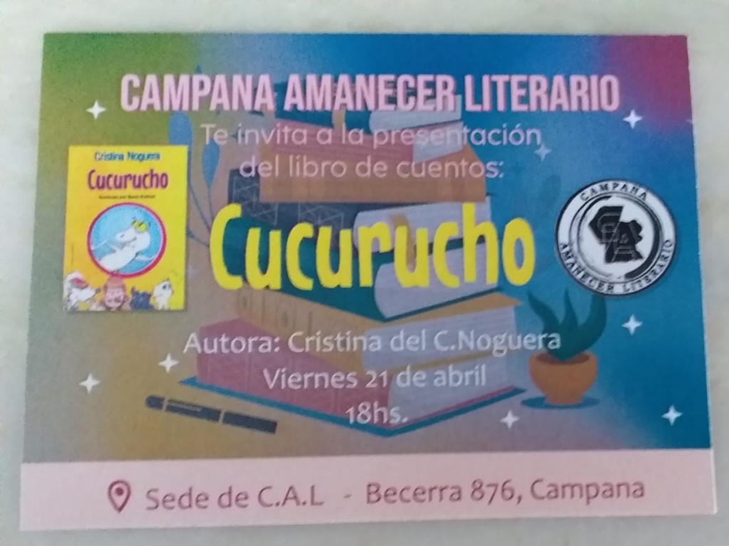 Este viernes a las 18 se presentará el libro de cuentos "Cucurucho" de la escritora Cristina Noguera. Será en la sede de Campana Amanecer Literario, con entrada libre y gratuita. AUDIO: CRISTINA NOGUERA - escritora