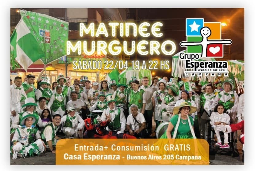 Este sábado de 19 a 22 el Grupo Esperanza realizará el primer matineé del año. Será en la Casa Esperanza y los jóvenes contarán con la participación del color y la alegría de la murga Esperanza. También se podrán comprar choripanes para colaborar con la institución,