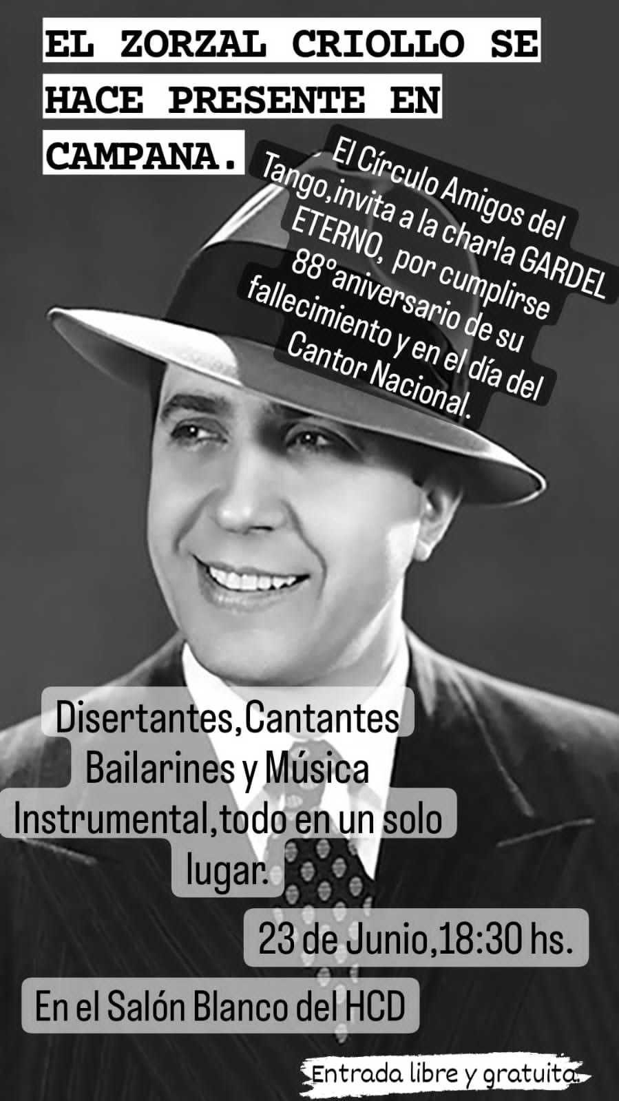El Círculo Amigos del Tango homenajeará a Carlos Gardel a 88 años de su fallecimiento. Será con un evento gratuito este viernes, a las 18:30, en el Salón Blanco del Concejo Deliberante. La entrada es libre y gratuita. AUDIO: MARTA MAGISTRATI - Vicepresidenta CAT