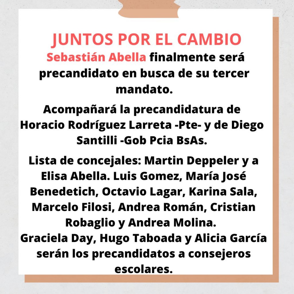 El intendente Sebastián Abella será precandidato en busca de su tercer mandato. Acompañará la precandidatura de Horacio Rodríguez Larreta a presidente y de Diego Santilli a gobernador de la provincia de Buenos Aires. La lista de concejales que lo acompañarán la encabezan Martin Deppeler y Elisa Abella. AUDIO: SEBASTIÁN ABELLA - precandidato a intendente