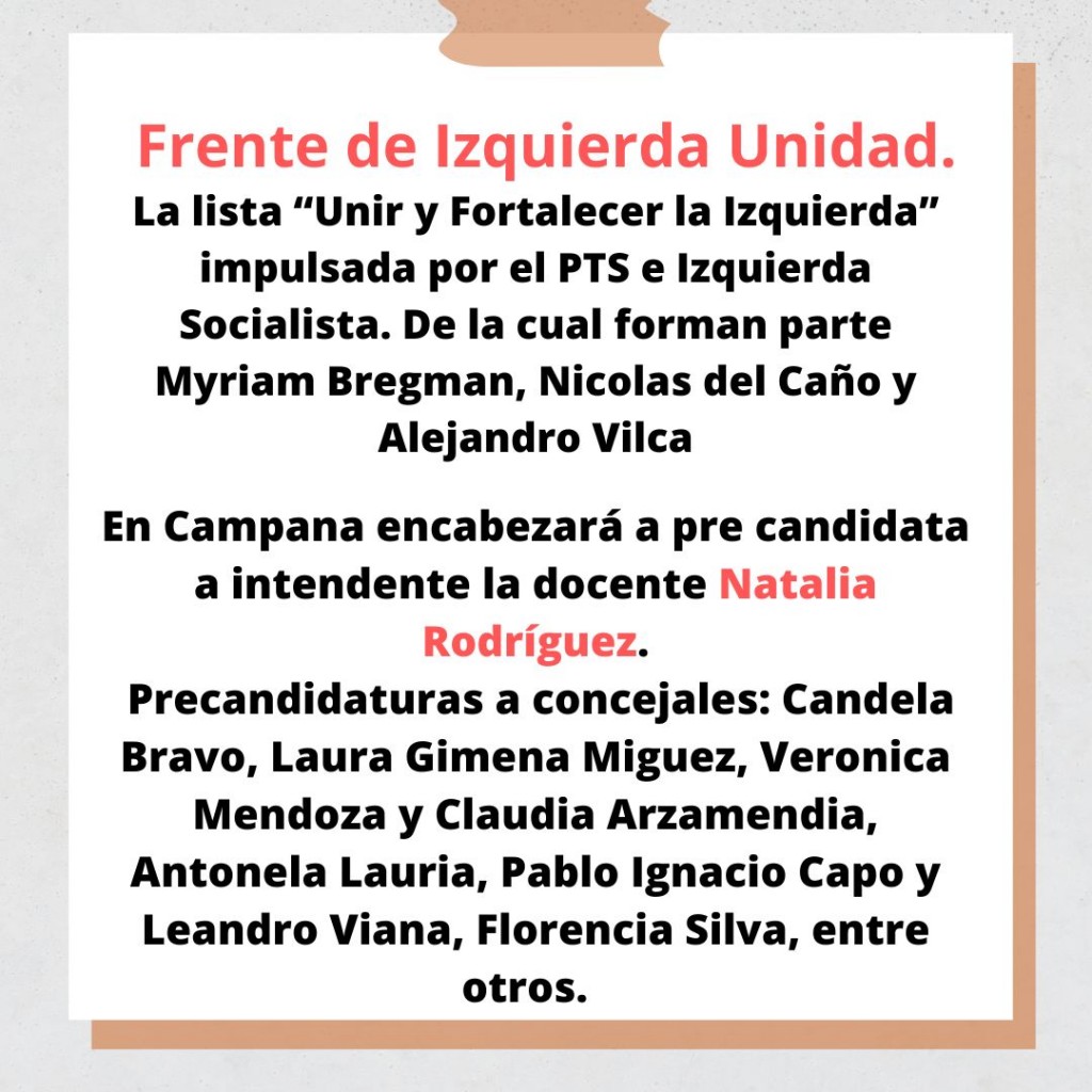 El Frente de Izquierda tendrá por lo menos dos listas en nuestra ciudad. La denominada "Unir y fortalecer la izquierda" está encabezada por la docente Natalia Rodríguez como precandidata a intendente. Candela Bravo se ubica como primer concejal. AUDIO: NATALIA RODRÍGUEZ - precandidata a intendente