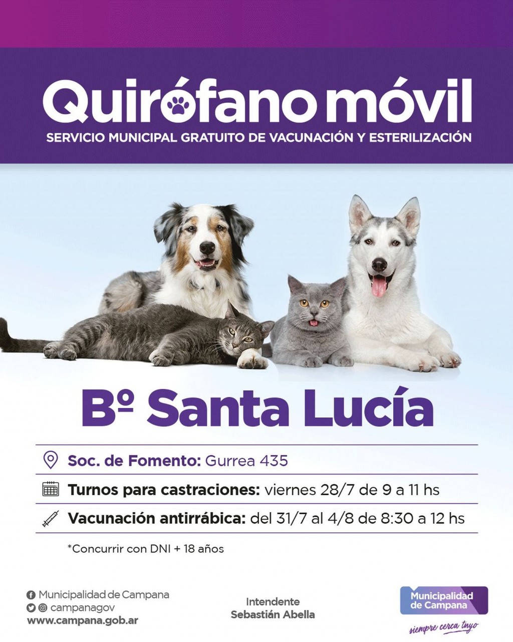 El quirófano móvil visitará el barrio Santa Lucía para llevar adelante un nuevo operativo de castración y vacunación gratuita. Todos aquellos que quieran concurrir con sus mascotas deberán retirar un turno mañana de 9 a 11, en la sociedad de fomento del barrio. AUDIO: GONZALO BRUTTI - Director General de calidad ambiental, bromatología y zoonosis