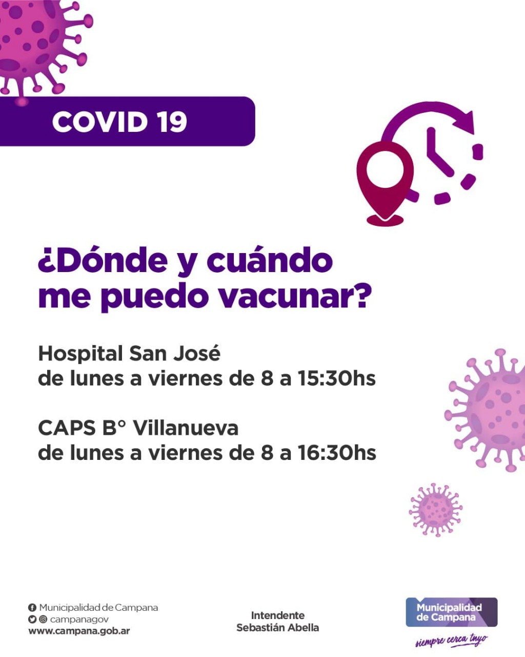 Desde la Secretaría de Salud de Campana recuerdan la importancia de mantener la vacunación Covid al día. Se pueden aplicar en el Hospital de lunes a viernes de 8 a 15:30 o en el CAPS de Barrio Villanueva de lunes a viernes de 8 a 16:30. Y los sábado de 8 a 10 en ambos lugares. AUDIO: ELEONORA PENOVI - subsecretaria de salud