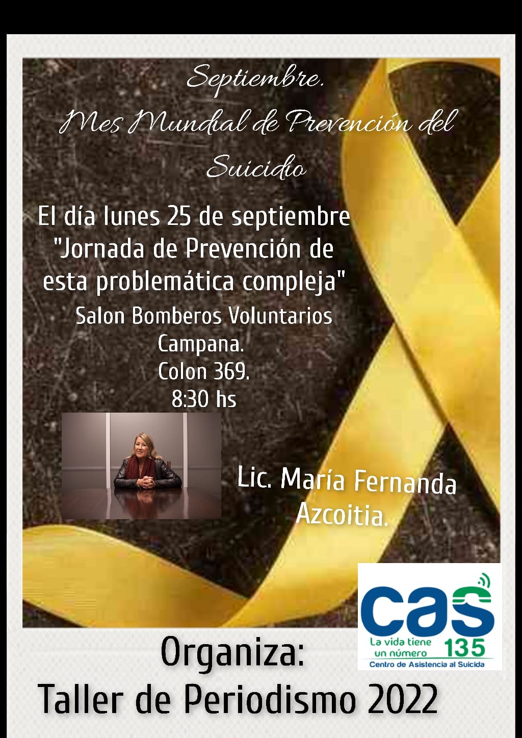 En el marco del mes mundial de prevención del suicidio se realizará el próximo lunes una jornada sobre esta problemática compleja. Será en el salón de Bomberos Voluntarios, Colón 369 a las 8:30. Estará a cargo de la Lic. María Fernanda Azcoitia. AUDIO: RITA GARCÍA - organizadora