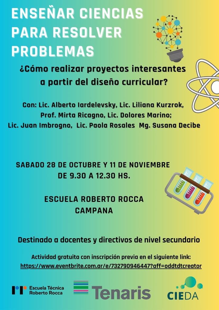CIEDA, la Escuela Técnica Roberto Rocca y Tenaris, organizan una capacitación gratuita para docentes secundarios. Serán dos encuentros: el sábado 28 de octubre y 11 de noviembre en la ETRR. Tiene como objetivo experimentar un modelo de intervención pedagógica para la enseñanza activa de las ciencias a docentes de nivel secundario, directores y público interesado. AUDIO: ALFREDO VOTA - director CIEDA // LUIS GRIECO - gte. de relaciones con la comunidad de Tenaris