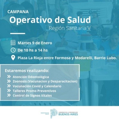 Promotores de salud de nuestra ciudad junto con personal de la Región Sanitaria V continúan visitando diferentes barrios. Mañana estarán en Barrio Lubo de 10 a 14 en la Plaza La Rioja entre Formosa y Modarelli. Los vecinos podrán realizarse controles odontológicos, chequeos básicos de salud y la aplicación de vacunas de calendario. Se suma también controles para los animales. AUDIO: EUGENIA ARISTÍA - Promotora de salud