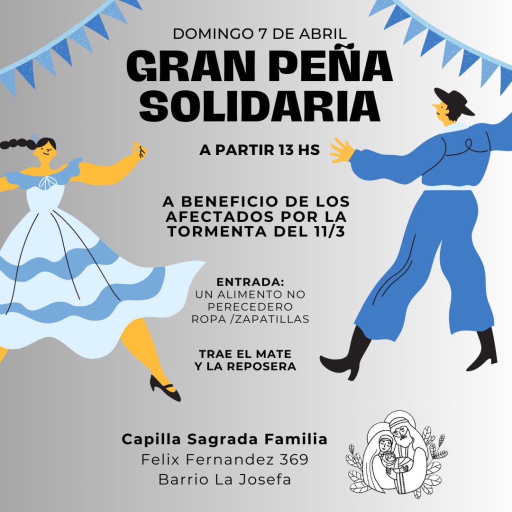 El domingo 7 de abril se realizará una gran peña a beneficio de los afectados por la tormenta de principios de marzo. Será en la Capilla Sagrada Familia de Barrio La Josefa a partir de las 13. La entrada es un alimento no perecedero, zapatillas o ropa en buen estado. AUDIO: JUAN MODARELLI - diácono permanente