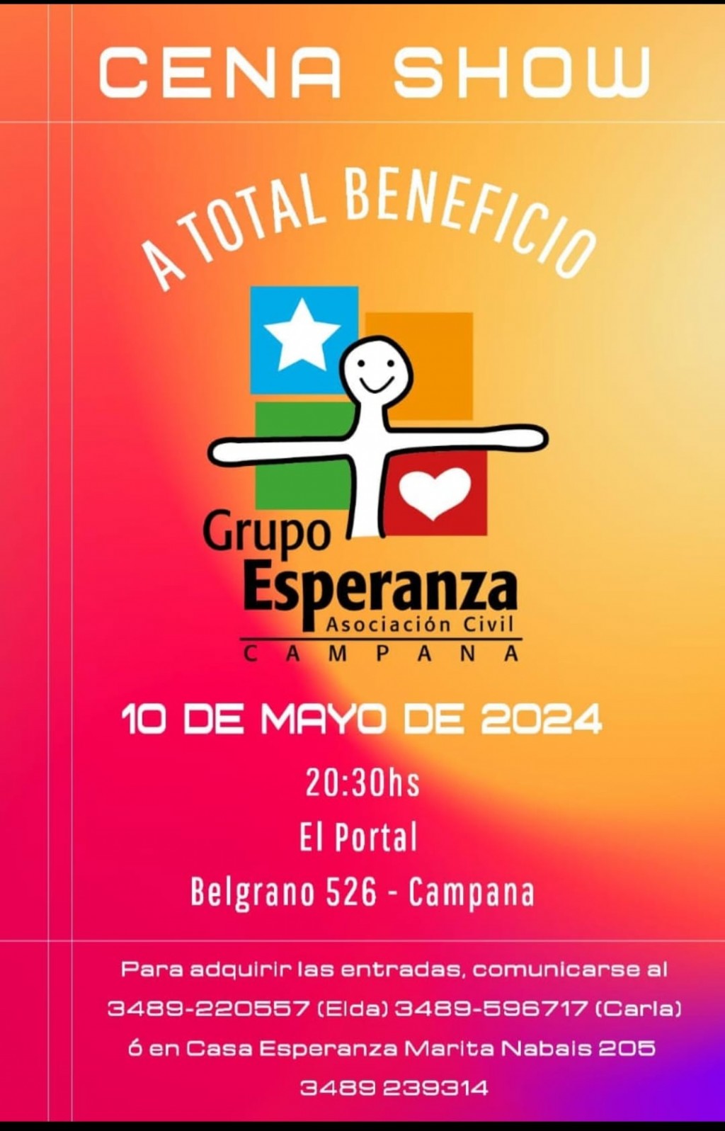 Se realizará el 10 de mayo en el salón El Portal a las 20:30. Será a total beneficio de la Asociación Civil Grupo Esperanza. Las entradas anticipadas ya están a la venta. AUDIO: ELDA BOCCA DE IGLESIAS - Grupo Esperanza