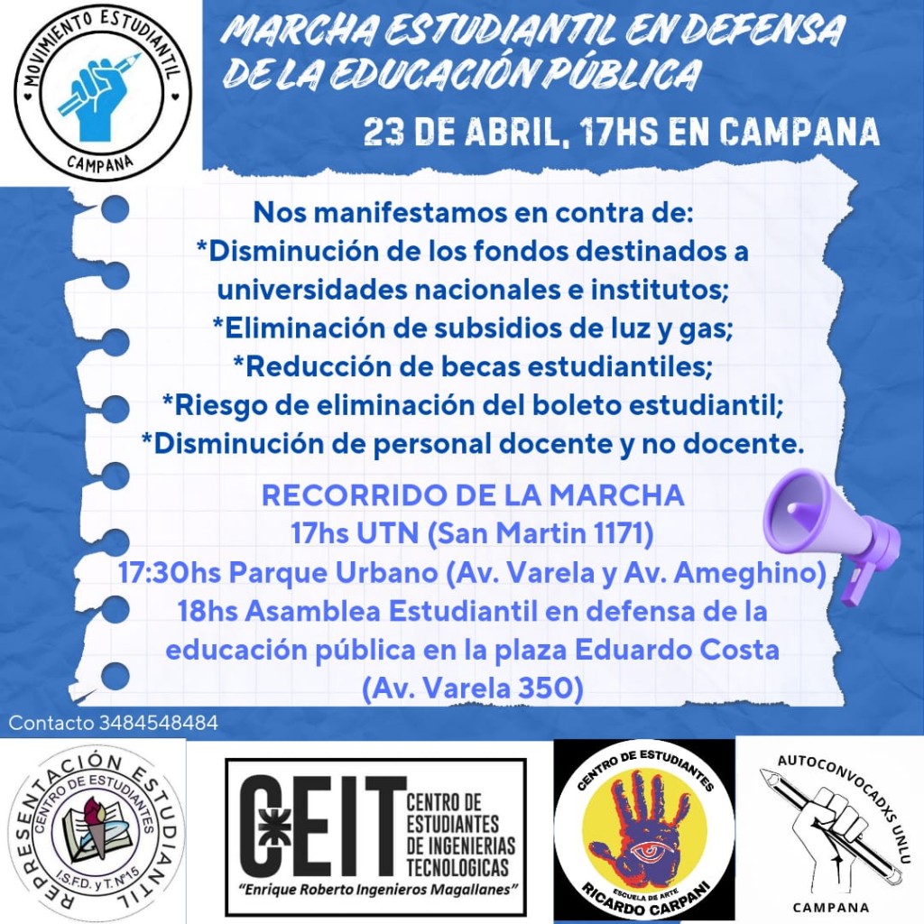 En nuestra ciudad la manifestación de las instituciones de educación superior partirá desde la sede de la UTN a las 17. El recorrido terminará en la Plaza Eduardo Costa con un acto previstos para las 18. AUDIO: CINTHIA SPADARO - Ctro de estudiantes del ISFDyT 15
