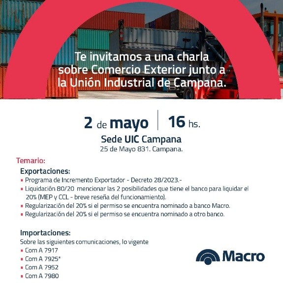 Banco Macro y la Unión Industrial de Campana realizarán este jueves a las 16 una charla sobre comercio exterior. Será en la sede de la UIC, 25 de mayo 831. La participación es abierta y gratuita. AUDIO: LETICIA SILVESTRÍN - vicepresidente UIC