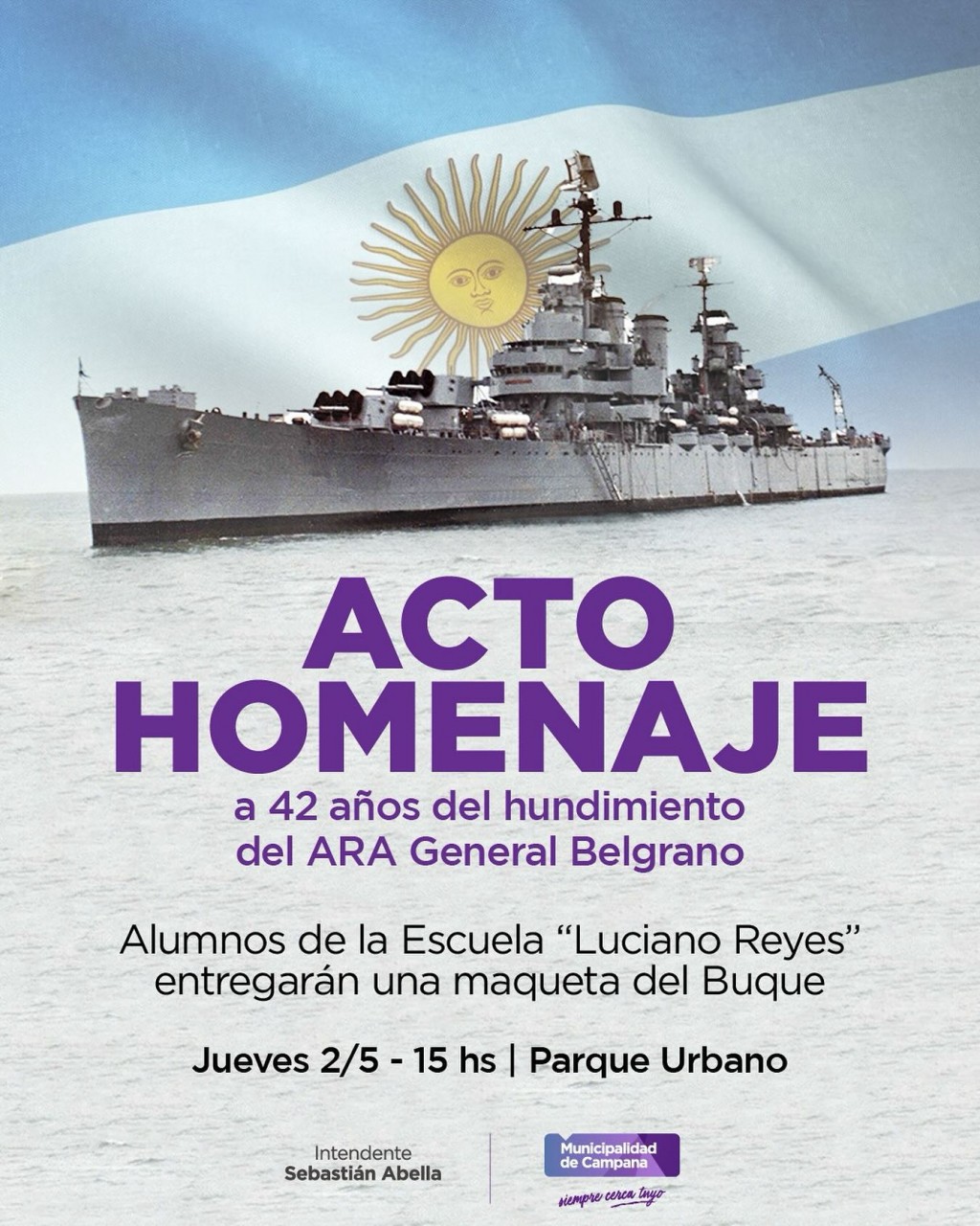 A 42 años del hundimiento del Crucero ARA General Belgrano en la guerra de Malvinas, se realizará el acto conmemorativo. Será el jueves a las 15 en el Parque Urbano. Alumnos de la escuela técnica “Luciano Reyes” entregarán una maqueta del buque. AUDIO: RICARDO CÓRDOVA - veterano de Malvinas