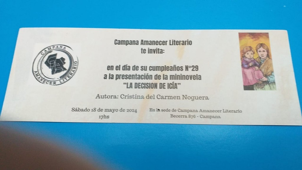 Campana Amanecer Literario cumple 29 años y lo festejará con la presentación de la mininovela “La decisión de Icia” de la escritora Cristina del Carmen Noguera. Será el sábado a las 17 en la sede de la institución, Becerra 876. AUDIO: STELLA MARIS GÓNZALEZ CHUQUEL - Pte. CAL