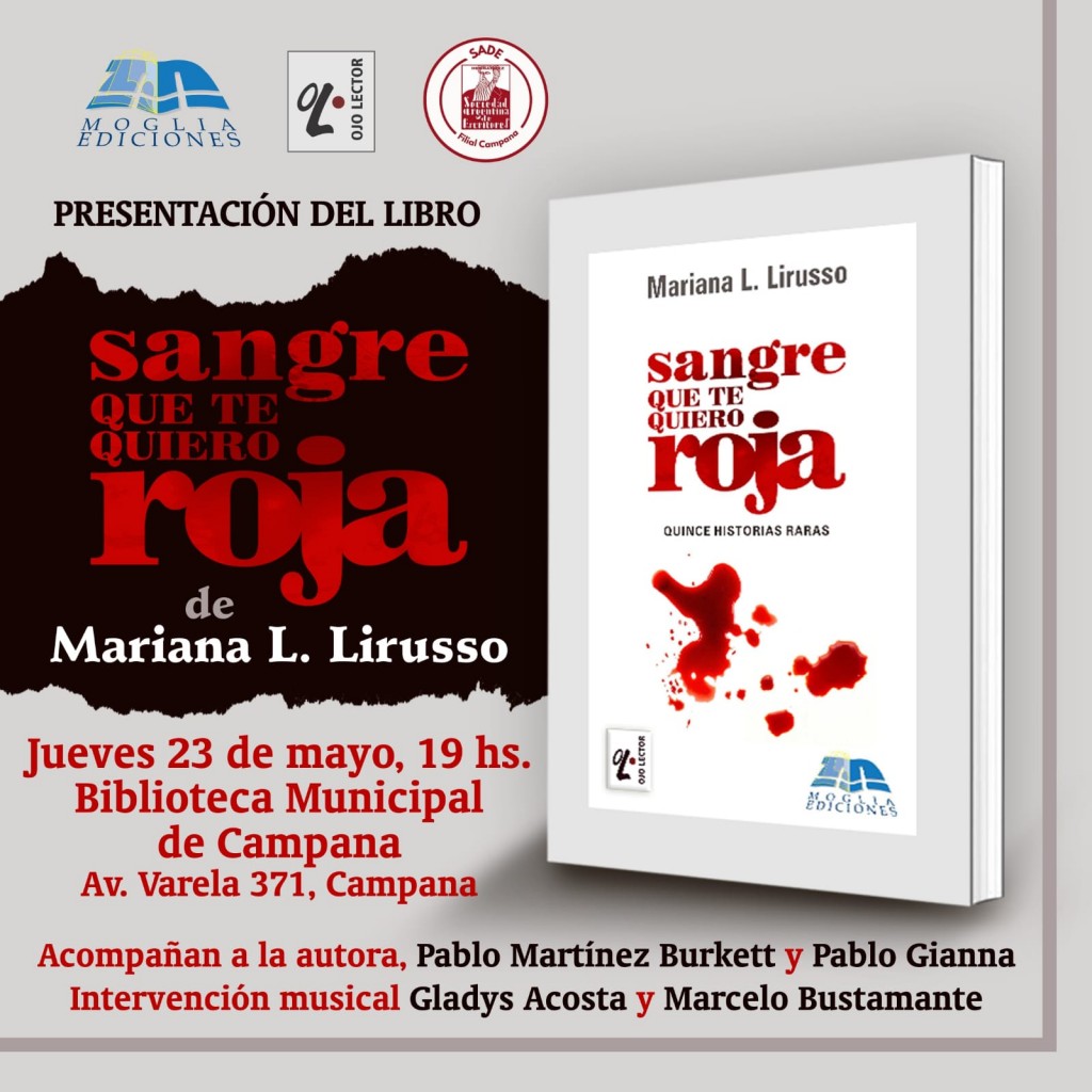 Este jueves a las 19 en la Biblioteca Municipal se presentará el libro “Sangre que te quiero roja” de la escritora Mariana Lirusso. Estará acompañada por escritores invitados y habrá una intervención musical. AUDIO: MARIANA LIRUSSO - escritora