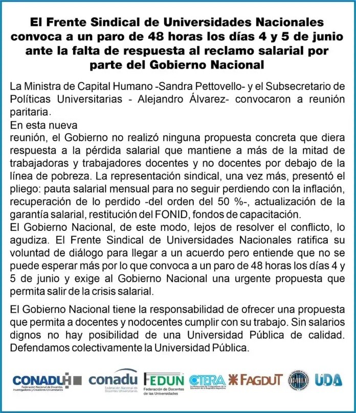 La medida de fuerza fue convocada por los docentes universitarios para este martes y miércoles por falta de acuerdo paritario. Desde el Frente Sindical de Universidades Nacionales reclaman respuestas al Gobierno de Javier Milei y la presentación de una oferta salarial. AUDIO: GISELLA VARGAS - asistente de dirección UNLu Campana