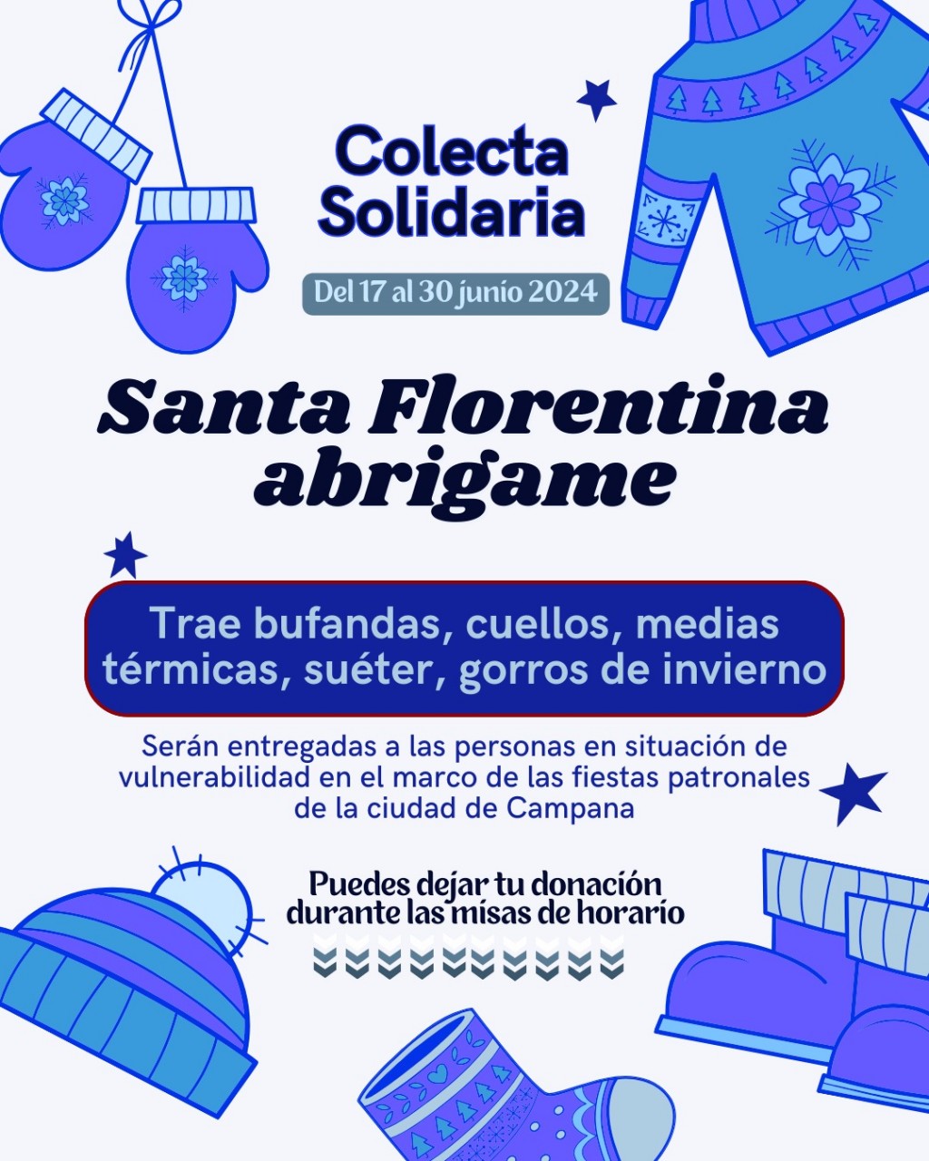 En el marco de sus fiestas patronales, desde Catedral invitan a ser manos y corazón de Cristo para aquellos que más lo necesitan. La iniciativa bajo el lema "Santa Florentina abrígame" pide la colaboración de bufandas, suéteres, cuellos, medias térmicas y gorros de invierno para abrigar a aquellos en situación de vulnerabilidad. AUDIO: FERNANDO CREVATÍN - Párroco