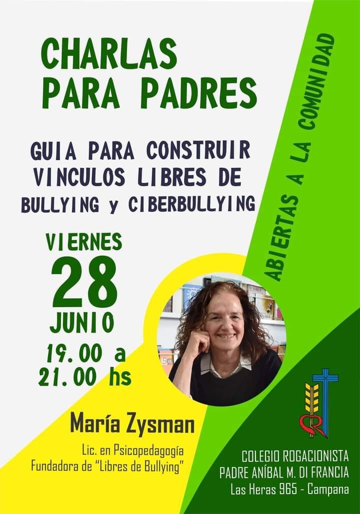 Desde el Colegio Padre Aníbal María Di Francia abren a la comunidad una charla para padres a cargo de la Lic. María Zysman. Será una guía para construir vínculos libres de bullying y ciberbullying. Se realizará este viernes a partir de las 19 en la sede del Colegio. AUDIO: PDRE. RODRIGO GOLÁN - sacerdote rogacionista