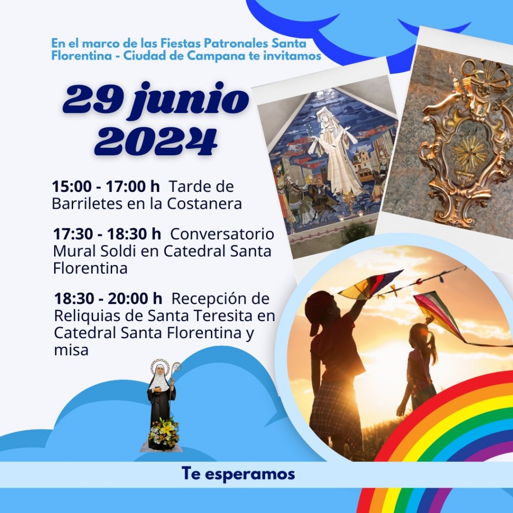 Este sábado se realizarán diversas actividades celebrando a Santa Florentina. Desde las 15 en la Costanera se hará una barrileteada. A las 17:30 organizaron un conversatorio sobre el Mural de Soldi y la historia de la Catedral. Y desde las 18:30 recibirán las Reliquias de Santa Teresita. AUDIO: MÓNICA NOVELLI - comunidad de Catedral
