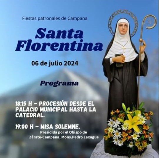 Este sábado se celebrará a la patrona de Campana, Santa Florentina. A las 18:15 se realizará la procesión desde el Palacio Municipal hasta la Catedral. La Santa Misa solemne será a las 19 presidida por nuestro Obispo Diocesano Mons. Pedro Laxague. AUDIO: FERNANDO CREVATÍN - párroco de Catedral