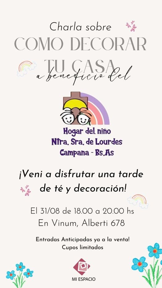 Se realizará una charla sobre cómo decorar casas. Lo recaudado será donado al Hogar del Niño Nuestra Señora de Lourdes Campana. Será el sábado 31 de agosto en Vinum, Alberti 678. Las entradas son anticipadas y los cupos limitados. AUDIO: JUAN ERRECALDE - director Hogar del Niño