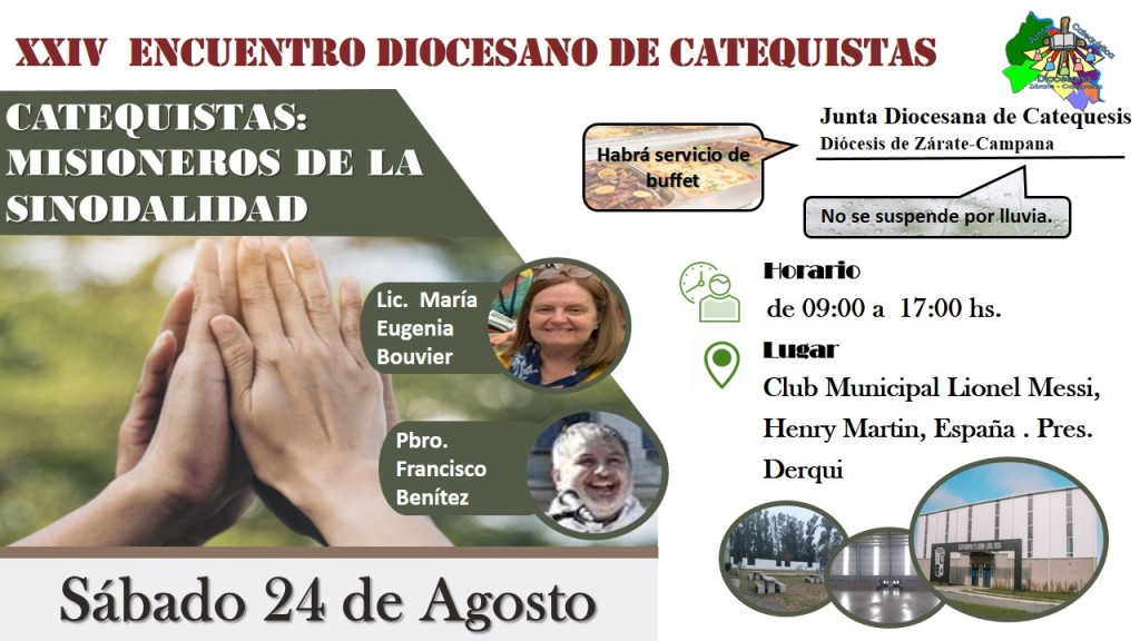 Con el lema "Catequistas: misioneros de la sinodalidad” los catequistas de la Diócesis de Záate-Campana se encontrarán este sábado 24 de agosto de 9 a 17 en el Club Municipal Leonel Messi en Pte. Derqui. AUDIO: Pdre. FERNANDO CREVATÍN - Delegado diocesano de la pastoral de catequesis