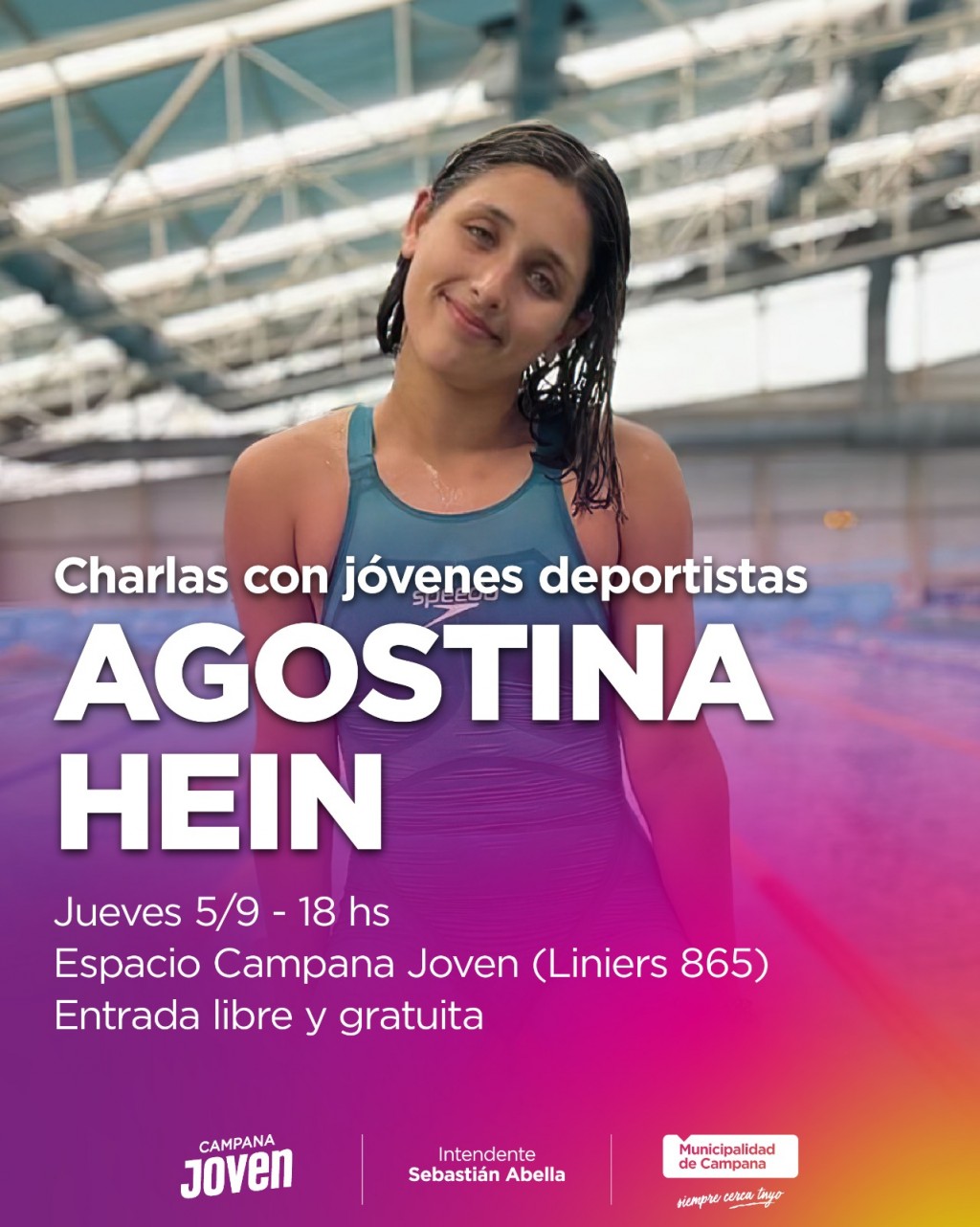 Comienza el ciclo con jóvenes deportistas, organizado por el Municipio. El primer encuentro contará con la participación de la nadadora olímpica Agostina Hein. Será este jueves, a las 18, en el Espacio Campana Joven (Liniers 865). No se requiere inscripción previa. AUDIO: MATÍAS LUGO - Director de deportes