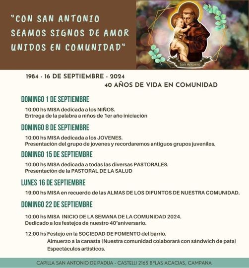 Comenzaron las celebraciones por los 40 años de la comunidad. Cada domingo se rezará por una intención particular. El lunes 16 celebrarán la misa por los difuntos de la comunidad y el domingo 22 la misa por el inicio de la semana de la comunidad y posteriormente los festejos en la Sociedad de Fomento del barrio Las Acacias. AUDIO: MABEL PINTOS - comunidad San Antonio de Padua