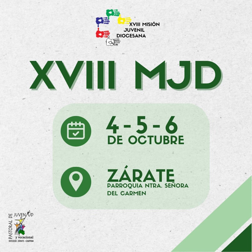 Bajo el lema “Vayan, inviten y sean misioneros de esperanza” se realizará la 18° Misión Juvenil Diocesana. Será el 4, 5 y 6 de octubre en la Parroquia Nuestra Señora del Carmen de Zárate. La inscripción ya está abierta. AUDIO: LUCILA BEHR - pastoral juvenil