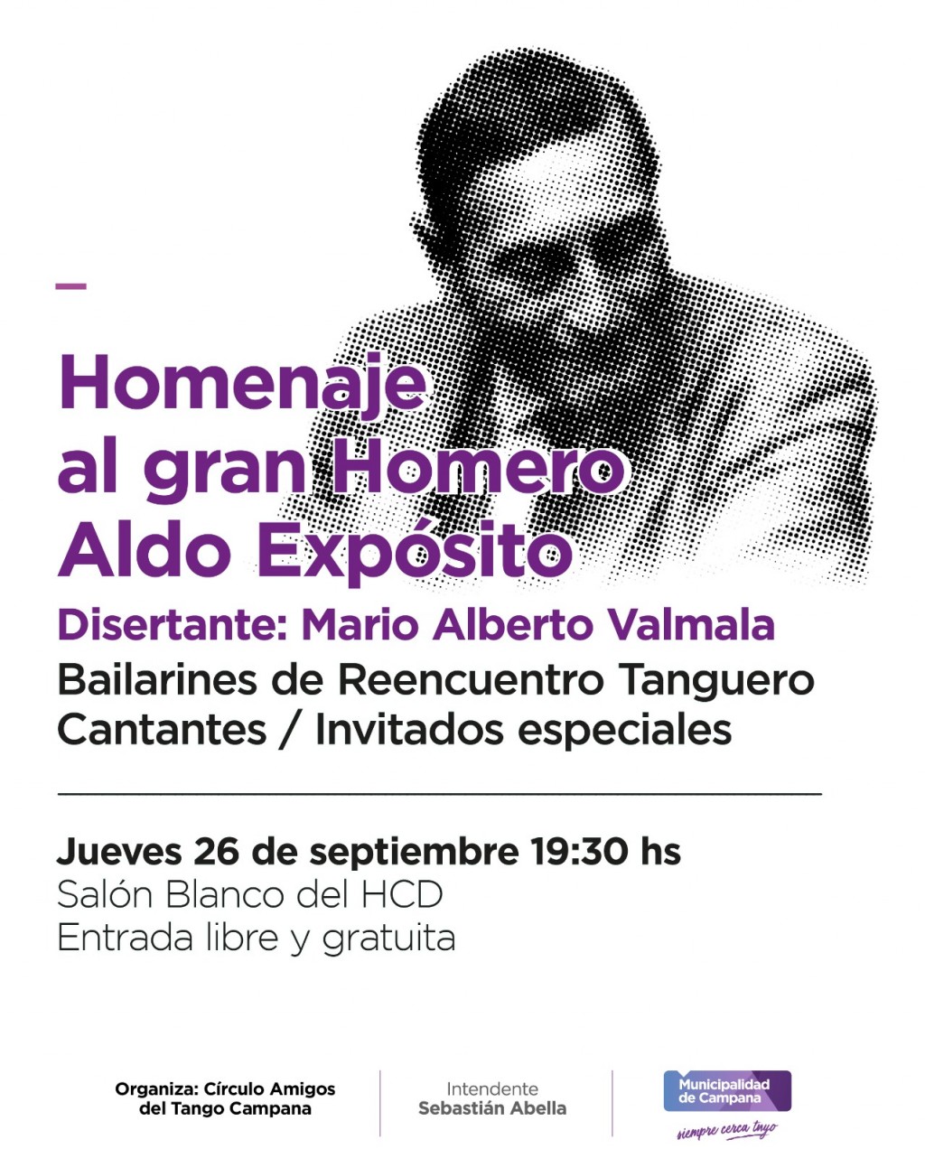 El Círculo Amigos del Tango realizará un homenaje a Homero Expósito. Será mañana en el salón blanco del Honorable Concejo Deliberante. Desde las 19:30 con la disertación de Mario Alberto Valmala. Habrá presentaciones artísticas. La entrada es libre y gratuita. AUDIO: MARTA MAGISTRATI - Vicepte. Círculo Amigos del Tango
