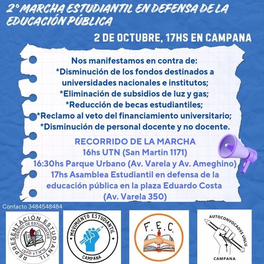 En Campana, mañana, también se replicará la Marcha Federal Universitaria, en defensa de la educación pública, gratuita y de calidad. La concentración en la Plaza principal de la ciudad será a las 17. Esta manifestación forma parte de una movilización a nivel nacional en contra del veto a la Ley de Financiamiento Universitario y darle visibilidad a la situación que atraviesan universidades. AUDIO: CINTIA SPADARO - Ctro de estudiantes Instituto 15 // MARTINA FORLANI - Frente estudiantil