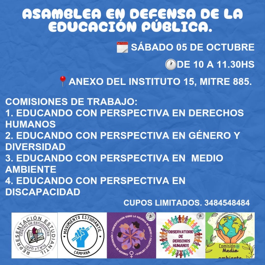 Se realizará este sábado de 10 a 11:30 en el Anexo del Instituto 15 que funciona en la Escuela 1. Será en defensa de la educación pública y trabajarán en diversas comisiones. AUDIO: CINTIA SPADARO - Pte. Ctro. de estudiantes Instituto 15