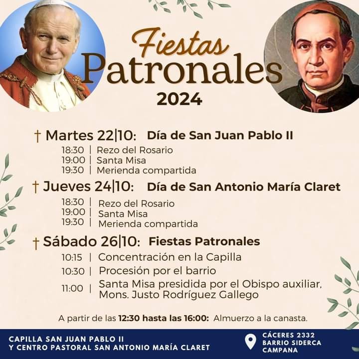 Se celebrarán desde mañana en la Capilla San Juan Pablo II y Centro Pastoral San Antonio María Claret. Mañana y el jueves las celebraciones comenzarán a las 18:30. La Misa de Acción de gracias será el sábado a las 11, presidida por el obispo auxiliar, Mons. Justo Rodríguez Gallego . AUDIO: PADRE FERNANDO CREVATÍN - párroco