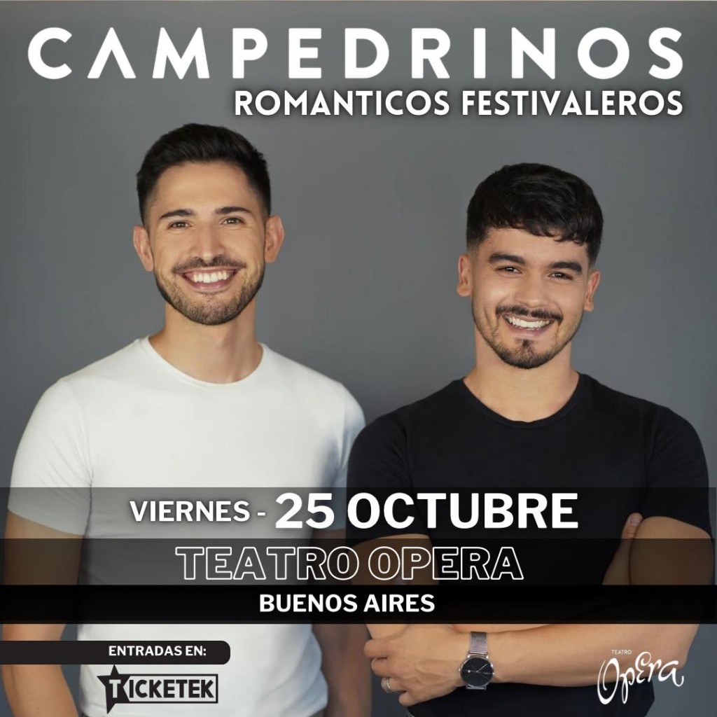 Los Campedrinos se presentarán este viernes en el teatro Ópera. Las entradas están a la venta por ticketek. Además adelantaron que hoy y mañana serán teloneros en el Estadio de Vélez de la banda Aventura que lidera Romeo Santos. AUDIO: SERGIO PRADA - Los Campedrinos