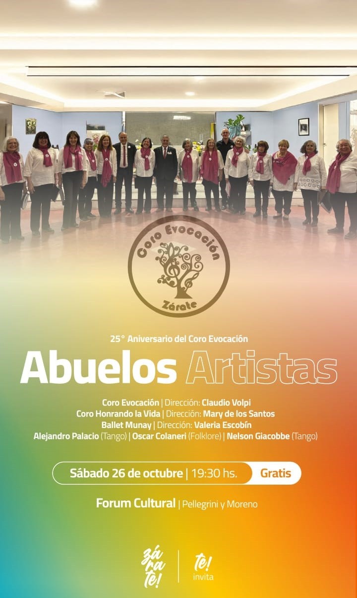 En el marco del 25° aniversario del Coro Evocación se presentarán Abuelos Artistas. Será este sábado a las 19:30 en el Forum Cultural de Zárate. La entrada es libre y gratuita. AUDIO: CLAUDIO VOLPI - director coral