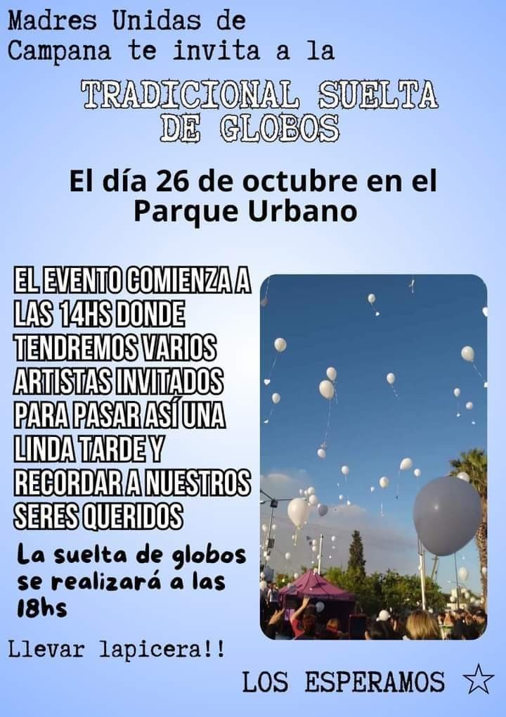 Las Madres Unidas de Campana invitan a la comunidad a sumarse a su tradicional suelta de globos blancos. El evento se realizará mañana en el Parque Urbano y comenzará a las 14 con la presencia de varios artistas. AUDIO: FABIANA GÓMEZ - Pte. Madres Unidas de Campana